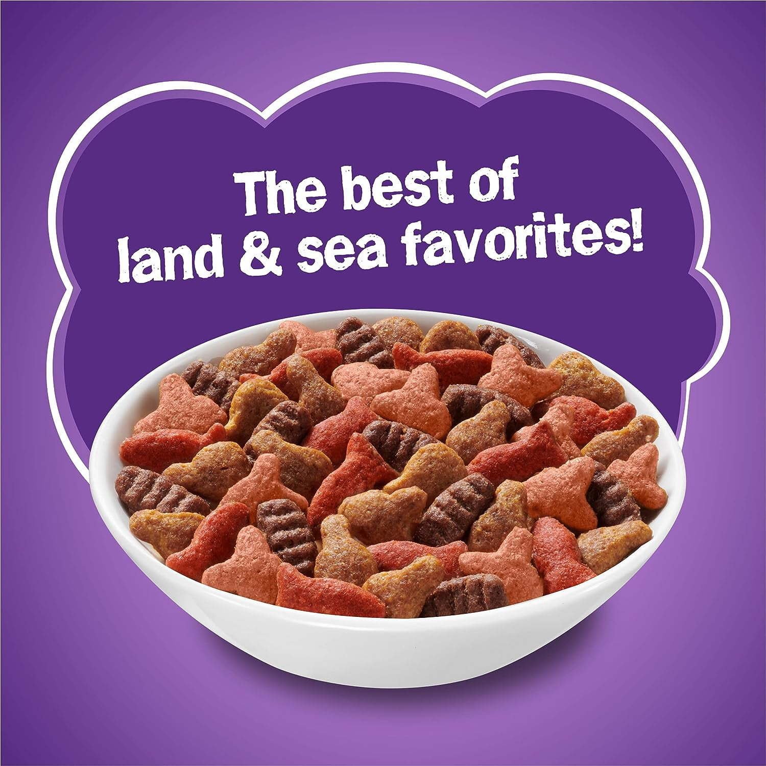 Serve your cat a nutritious and delicious flavor combination with Purina Friskies Surfin' & Turfin' Favorites dry cat food. Our Chicken, Ocean Whitefish, Salmon and Filet Mignon flavors deliver her favorite selections in one sensational serving, and the appealing shapes keep her excited about the dry food you feed her. Feel good about the essential vitamins and minerals found in this tasty dry cat food that support her whole-body health. The crunchy texture of our kibble cat food helps to keep her teeth clean. Featuring a formula that's complete and balanced for all life stages, this tempting recipe can follow her from her cuddly kitten days to her playful adult years for consistency in her daily diet. Essential fatty acids in this dry cat food help to support her healthy skin and coat, and antioxidants promote immune health. With so much savory goodness in every serving, this dry cat food shows your cat that you pay attention to her cravings and care about her health and happiness.