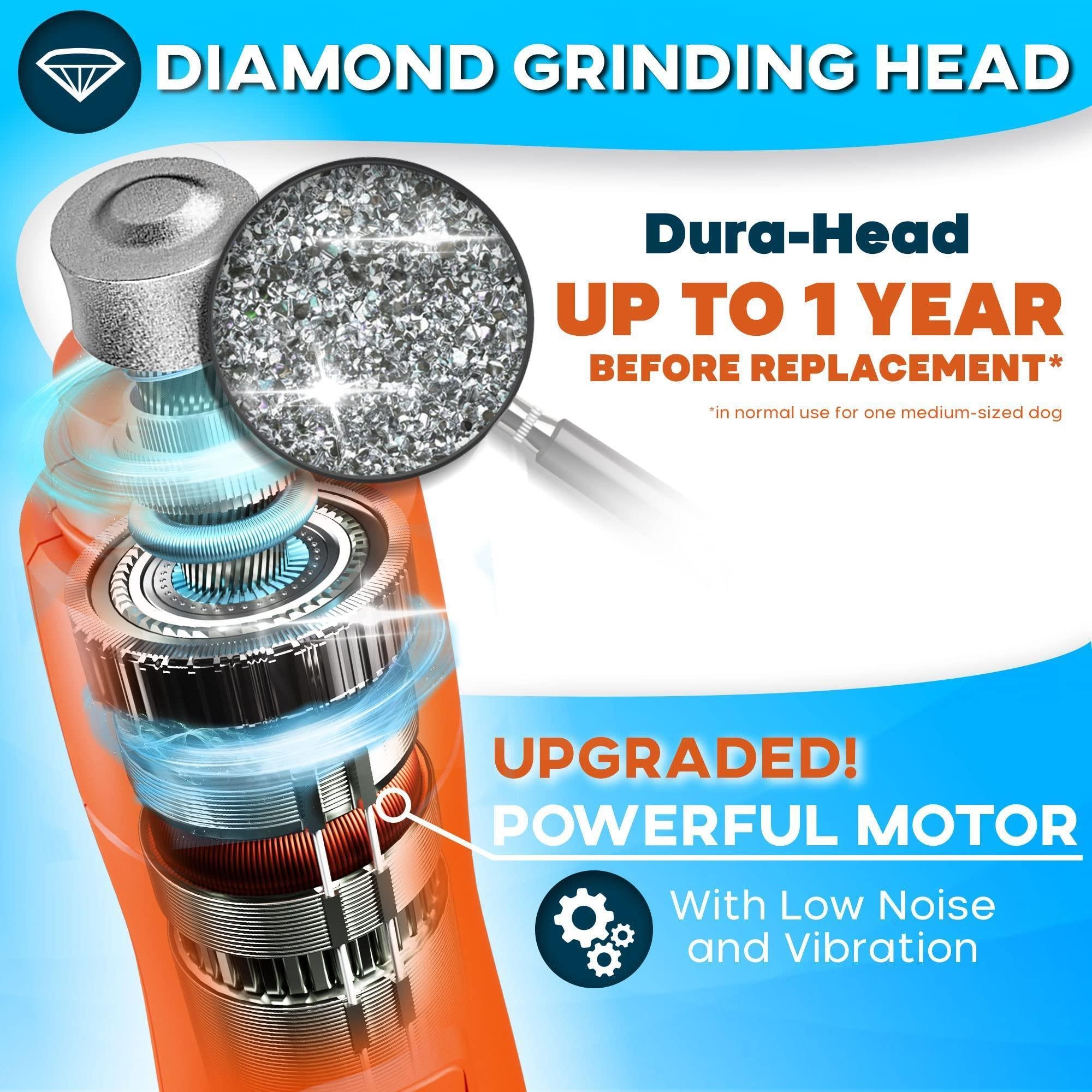 1.unlike a dog nail file, our pet nail grinder for dogs is made of high quality plastic, pleasant to the touch and comfortable to hold. this dog nail grinder features a diamond grinder head that allows you to reduce the excessive length of the canine's nails effortlessly.