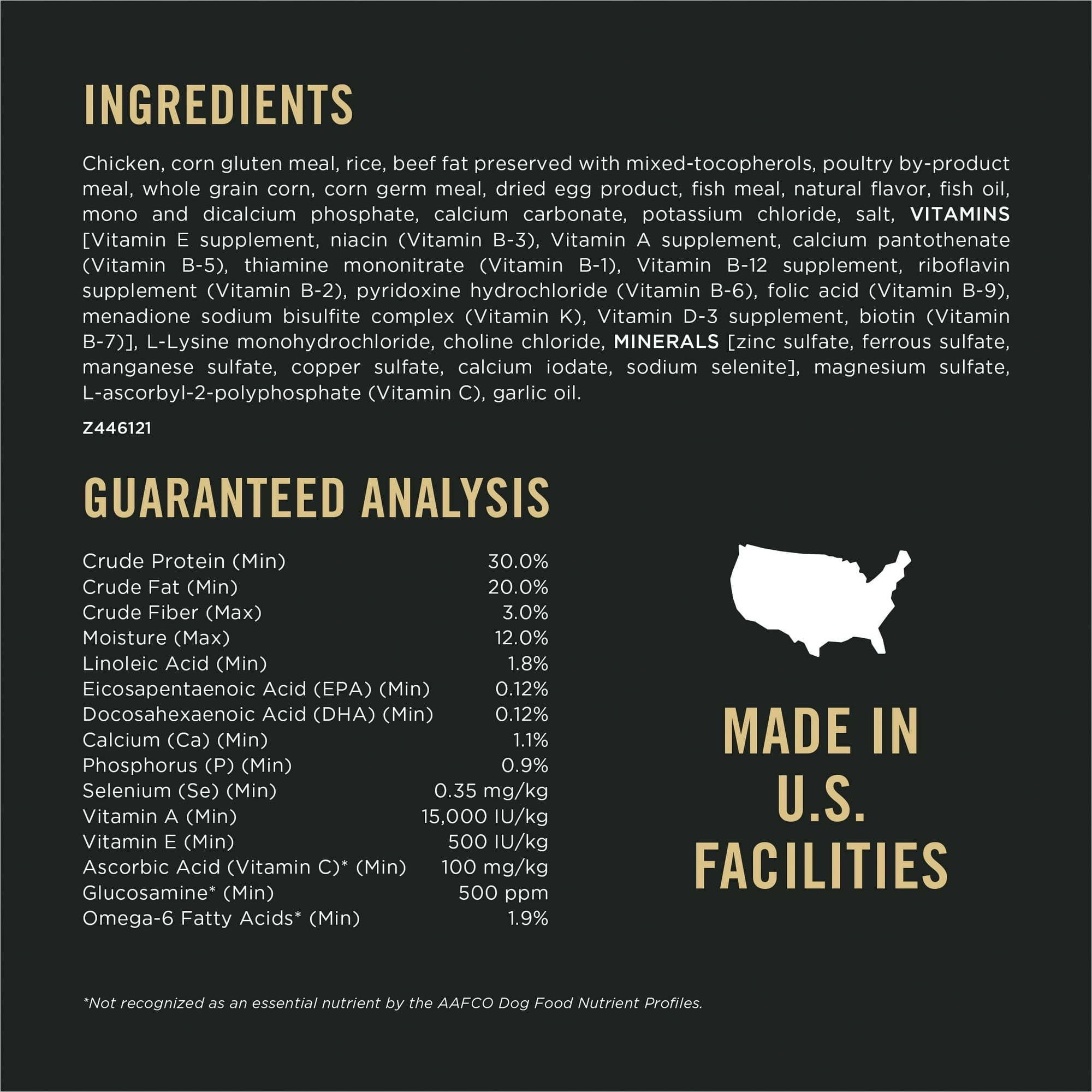 This Pro Plan dog food contains a blend of 30 percent protein and 20 percent fat to assist in caring for your dog's metabolic needs and help him maintain lean, strong muscles.